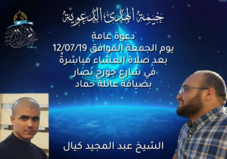 تدعوكم خيمة الهدى الدعوية في مدينة يافا للمشاركة مساء يوم الجمعة 12.7.2019 في الأمسية التي ستنظمها في ضيافة عائلة حماد بمدينة يافا، حيث ستُقام الامسية بعد صلاة العشاء مباشرة.