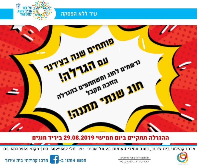 يُعلن مركز بيت شيرنر في مدينة يافا عن اجراء قرعة للفوز بعضوية مجانية في المركز لمدة عام كامل، وذلك يوم الخميس الموافق 29.8.2019.