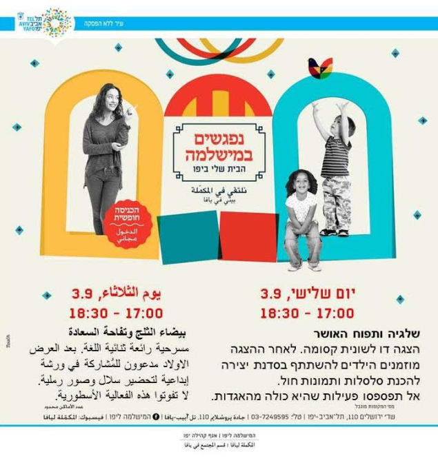 ينظم قسم المجتمع في المكملة ليافا الثلاثاء فعاليات شيّقة للأطفال في مبنى المكملة ليافا ، حيث ستنطلق الفعاليات في تمام الساعة 17:00 وتستمر لغاية 18:30.