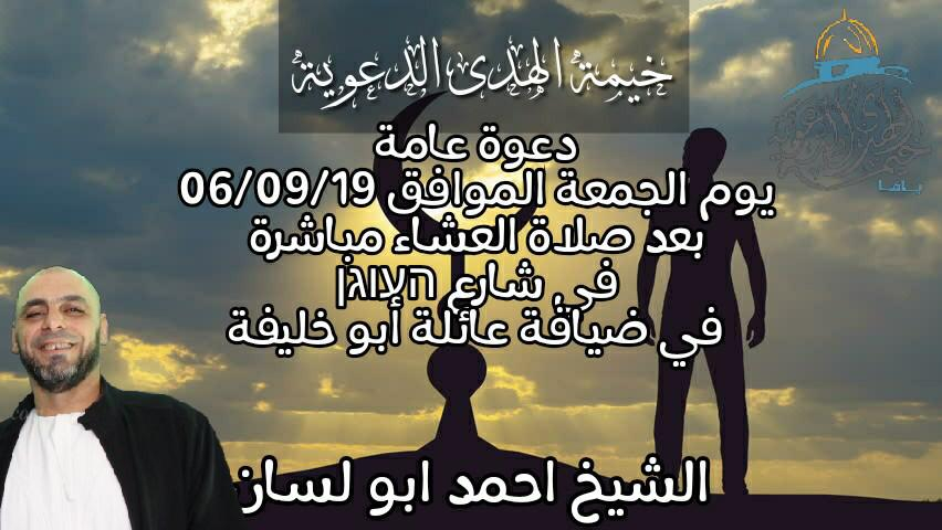 تدعوكم خيمة الهدى الدعوية في مدينة يافا للمشاركة مساء يوم الجمعة 6.9.2019 في الأمسية التي ستنظمها في ضيافة أبو خليفة بشارع هاعوجين بيافا، حيث ستُقام الامسية بعد صلاة العشاء مباشرة.