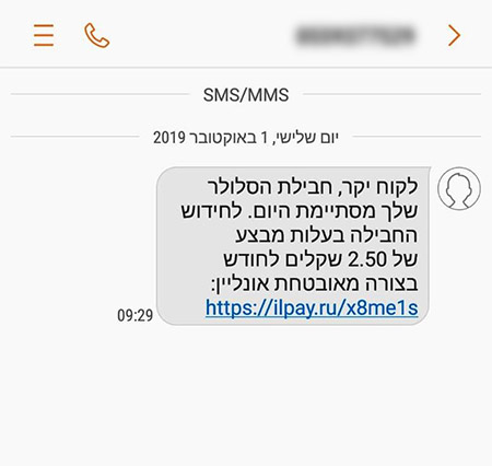 انتشرت في الساعات الأخيرة صورة عن رسالة قصيرة " اس ام اس " وصلت للكثيرين على هواتفهم النقالة باللغة العبرية ، وهذا نصها :" לקוח יקר, חבילת הסלולר ، שלך מסתיימת היום. לחידוש החבילה בעלות מבצע של 2.50 שקלים לחודש בצורה מאובטחת אונליין (קישור)" ، وترجمتها : " الزبون العزيز. رزمة الاتصال الخاصة بك تنتهي اليوم. لتجديد الرزمة بتكلفة الحملة 2.50 شيقل لمدة شهر بصورة آمنة (مرفق رابط).