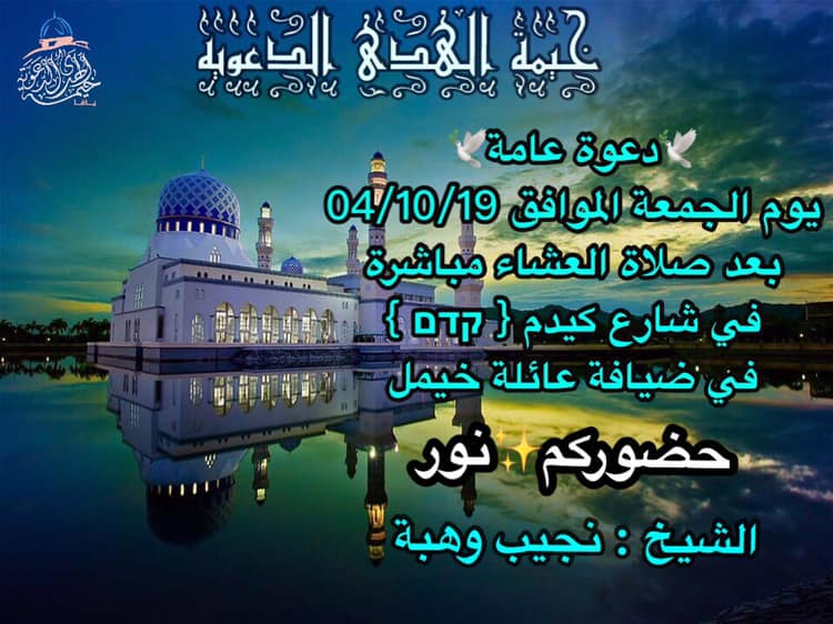 تدعوكم خيمة الهدى الدعوية في مدينة يافا للمشاركة مساء يوم غدٍ الجمعة 4.10.2019 في الأمسية التي ستنظمها في ضيافة عائلة خيمل بشارع كيدم بيافا، حيث ستُقام الامسية بعد صلاة العشاء مباشرة.