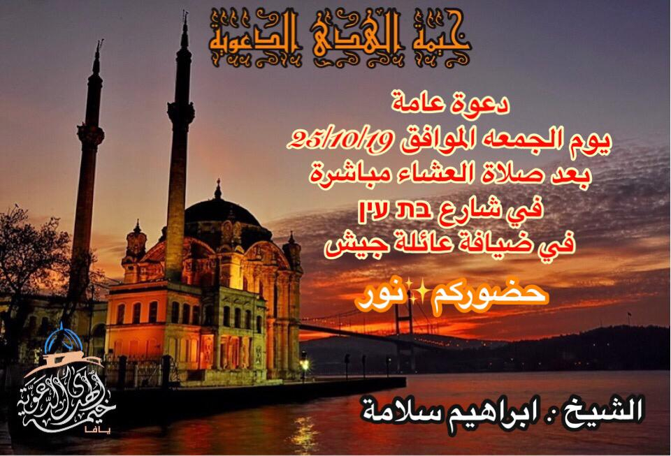 تدعوكم خيمة الهدى الدعوية في مدينة يافا للمشاركة مساء يوم غدٍ الجمعة 25.10.2019 في الأمسية التي ستنظمها في ضيافة عائلة جيش بيافا، حيث ستُقام الامسية بعد صلاة العشاء مباشرة عن روح الحاجة عايدة الجيش "ام سليم".