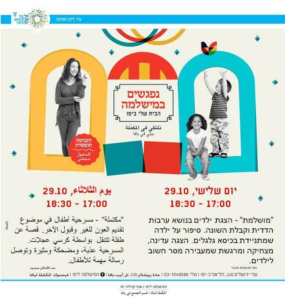 ينظم قسم المجتمع في المكملة ليافا الثلاثاء فعاليات شيّقة للأطفال في مبنى المكملة ليافا ، حيث ستنطلق الفعاليات في تمام الساعة 17:00 وتستمر لغاية 18:30.
