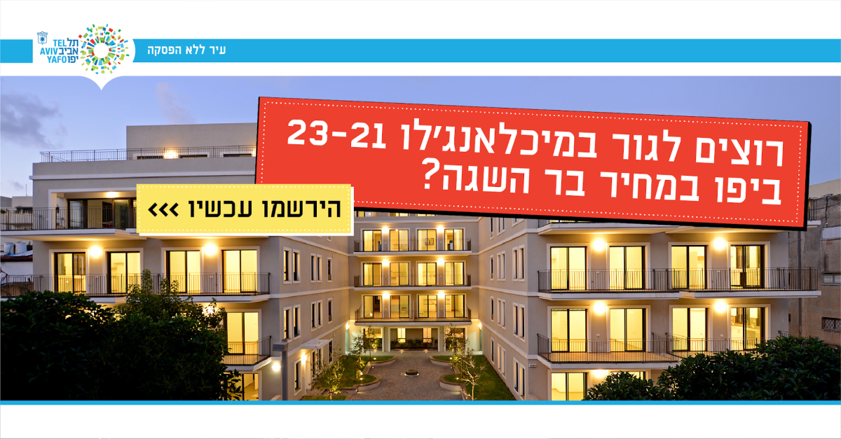 أعلنت بلدية يافا تل ابيب السكان اليافيين الى المسارعة في التسجيل للدخول في القرعة الدورة الثانية للحصول على شقة ضمن مشروع "سكن في متناول اليد" بشارع ميخائيل انجلو 21 - 23 بيافا.