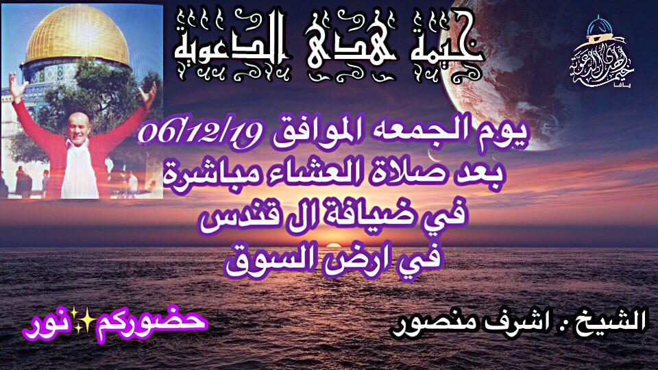 تدعوكم خيمة الهدى الدعوية في مدينة يافا للمشاركة مساء يوم غدٍ الجمعة 6.12.2019 في الأمسية التي ستنظمها في ضيافة آل قندس، بأرض السوق، حيث ستُقام الامسية بعد صلاة العشاء مباشرة.
