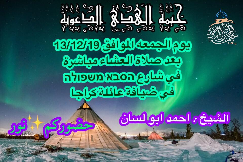 تدعوكم خيمة الهدى الدعوية في مدينة يافا للمشاركة مساء يوم الجمعة 13.12.2019 في الأمسية التي ستنظمها في ضيافة عائلة كراجة بيافا، حيث ستُقام الامسية بعد صلاة العشاء مباشرة.