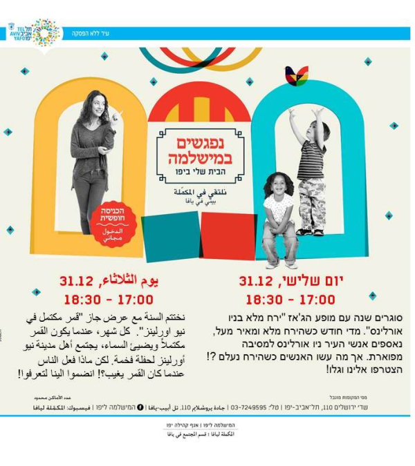 ينظم قسم المجتمع في المكملة ليافا الثلاثاء فعاليات شيّقة للأطفال في مبنى المكملة ليافا ، حيث ستنطلق الفعاليات في تمام الساعة 17:00 وتستمر لغاية 18:30.