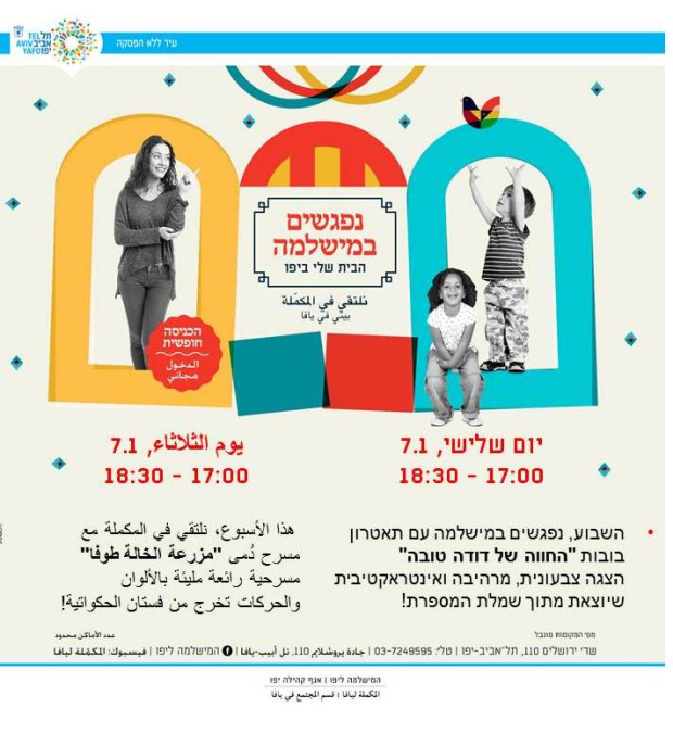 ينظم قسم المجتمع في المكملة ليافا الثلاثاء فعاليات شيّقة للأطفال في مبنى المكملة ليافا ، حيث ستنطلق الفعاليات في تمام الساعة 17:00 وتستمر لغاية 18:30.