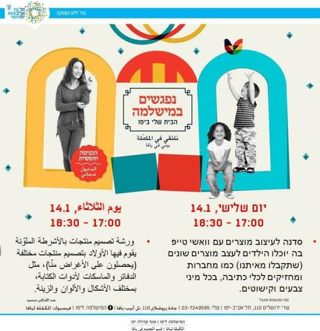 ينظم قسم المجتمع في المكملة ليافا الثلاثاء فعاليات شيّقة للأطفال في مبنى المكملة ليافا ، حيث ستنطلق الفعاليات في تمام الساعة 17:00 وتستمر لغاية 18:30.
