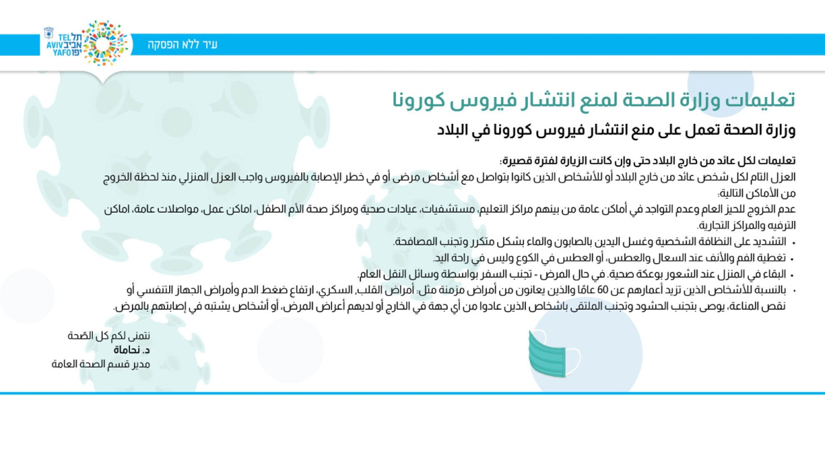أصدرت بلدية يافا تل ابيب نشرة تحوي على تعليمات من وزارة الصحة لمنع انتشار فيروس كورونا، جاء فيها "