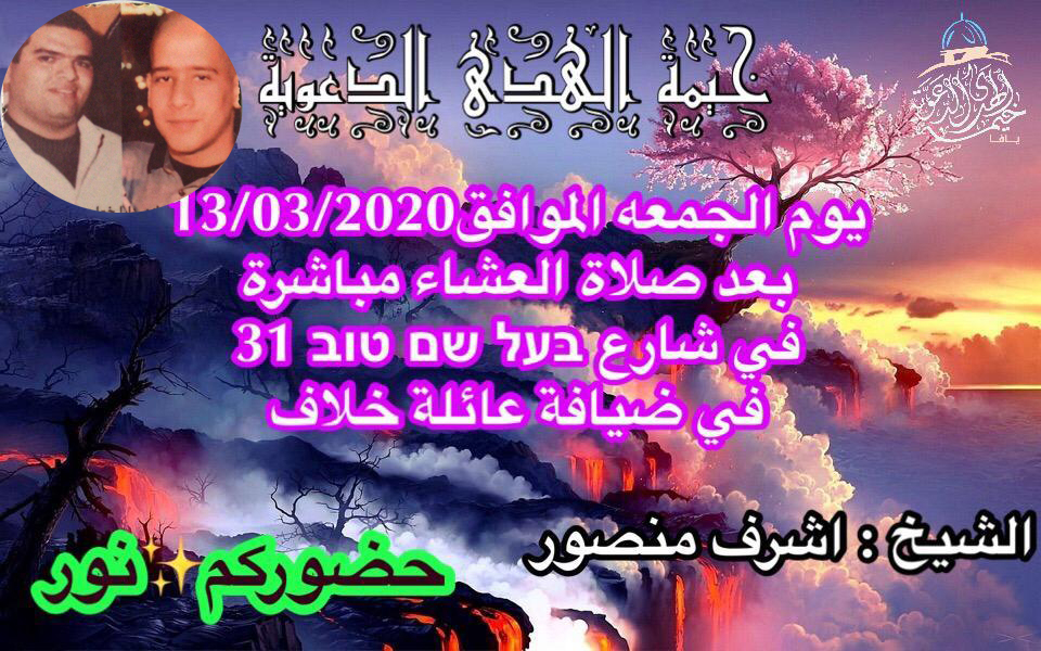 تدعوكم خيمة الهدى الدعوية في مدينة يافا للمشاركة مساء الجمعة المقبل 13.3.2020 في الأمسية الدعوية التي ستُنظمها في ضيافة عائلة خلاف بيافا، وذلك بعد صلاة العشاء مباشرة، وستكون الامسية عن روح كل من الشاب رامي خلاف وعمه.