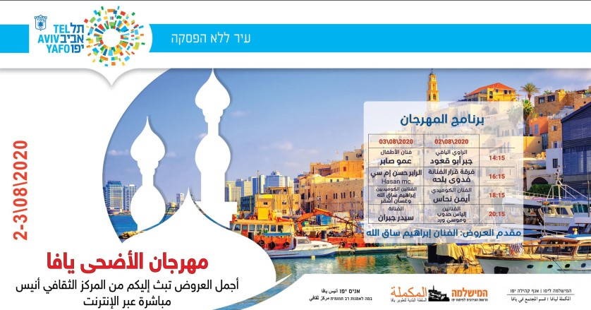يُنظم قسم المجتمع في المكملة ليافا وبالتعاون مع المركز الثقافي انيس يافا، مهرجان عيد الأضحى وذلك عبر البث المباشر على موقع التواصل الاجتماعي "فيسبوك"، حيث سيتخلل المهرجان جملة من الفقرات والعروض الشيّقة.