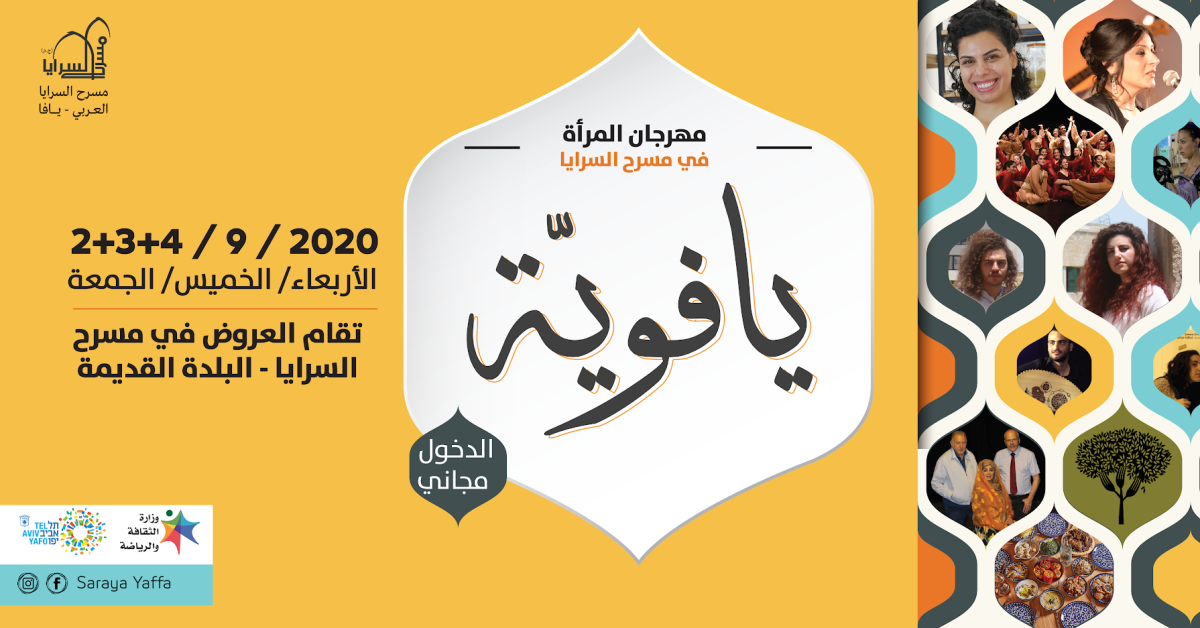 يستعد مسرح السرايا في مدينة يافا لإطلاق مهرجان المرأة تحت عنوان "يافوية"، والذي سيستمر طيلة 3 أيام على التوالي (الأربعاء، الخميس، الجمعة) 2+3+4 / 9 / 2020.