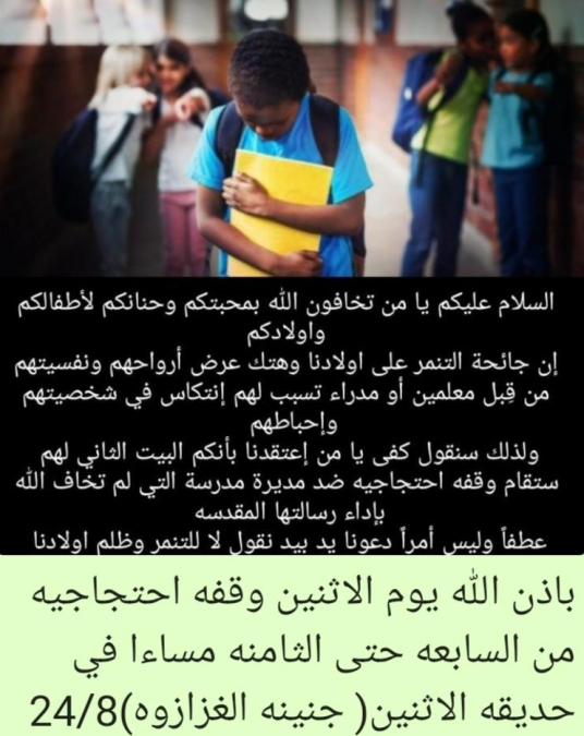 اريد مفهوم هذه "الوقفة الاحتجاجية " ، ما هو المطلوب من هذه الوقفة، اهي ضد التنمر بشكل عام ام هي مظاهرة ضد احدى المدراء في يافا ؟ يجب على الموقع ايضاح هذه المسألة بالمنشور قبل ان تدعي يافا للمظاهرة ، يجب على الموقع التوضيح ان السيدة " نور ابو شحادة " كانت من سكان يافا سابقا وان منذ عدة اعوام تزوجت وسكنت في جلجولية ، ليس لها اولاد في مدارس يافا وليس لها اولاد حتى في جيل الدراسة ، عيب على الموقع وعلى من كتب هذا المنشور ان ينشر جزء من الخبر وعدم التبيين بالدعوة ما هو هدف ال"وقفة الاحتجاجية"