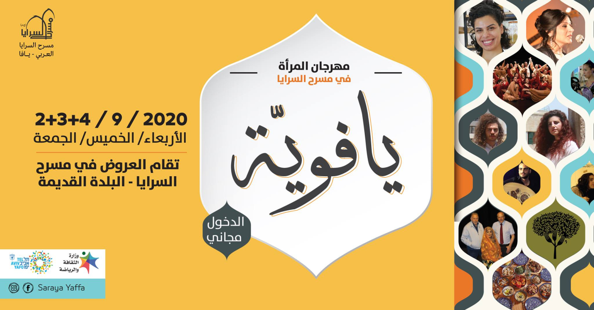 للسنة الرابعة على التوالي، يدعوكم مسرح السرايا العربي في يافا للمشاركة في فعاليات مهرجان المرأة "يافوية" الذي ينطلق اليوم الاربعاء ويستمر حتى يوم الجمعة 4.9.2020