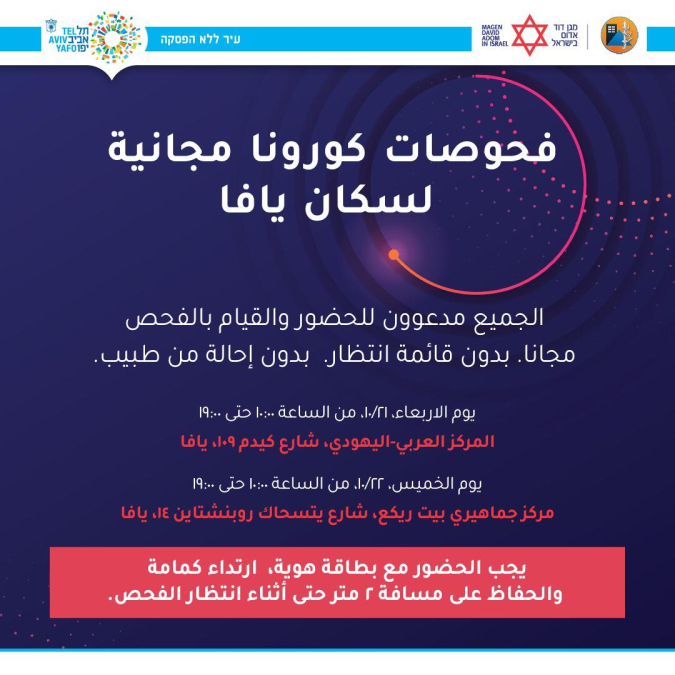 أعلنت بلدية يافا تل ابيب وبالتعاون مع نجمة داوود الحمراء ؛ عن افتتاح محطة لفحص الكورونا يوم غد الأربعاء في المركز الجماهيري الغربي اليهودي بشارع كيدم 109 بيافا؛ بين الساعات 10.00 وحتى الساعة 19.00.