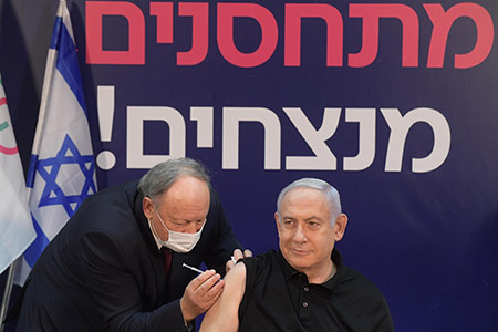 تلقى رئيس الحكومة الاسرائيلية بنيامين نتنياهو ووزير الصحة يولي ادلشطاين، تطعيما لفيروس الكورونا، مساء اليوم السبت ، في بث مباشر أمام الكاميرات . وبذلك بدأت حملة تطعيم المواطنين في البلاد ضد الفيروس، من مستشفى "شيبا" في تال هشومير، بهدف تشجيع المواطنين على التطعيم.