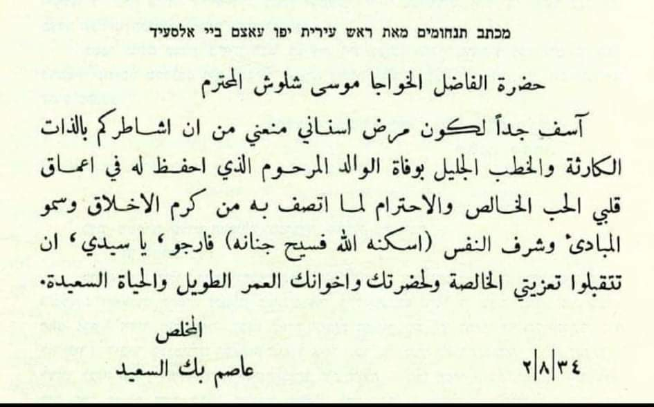 برقية تعزية من رئيس بلدية يافا عاصم بك السعيد لعائلة "شلوش" اليهودية تعود لعام 1934
