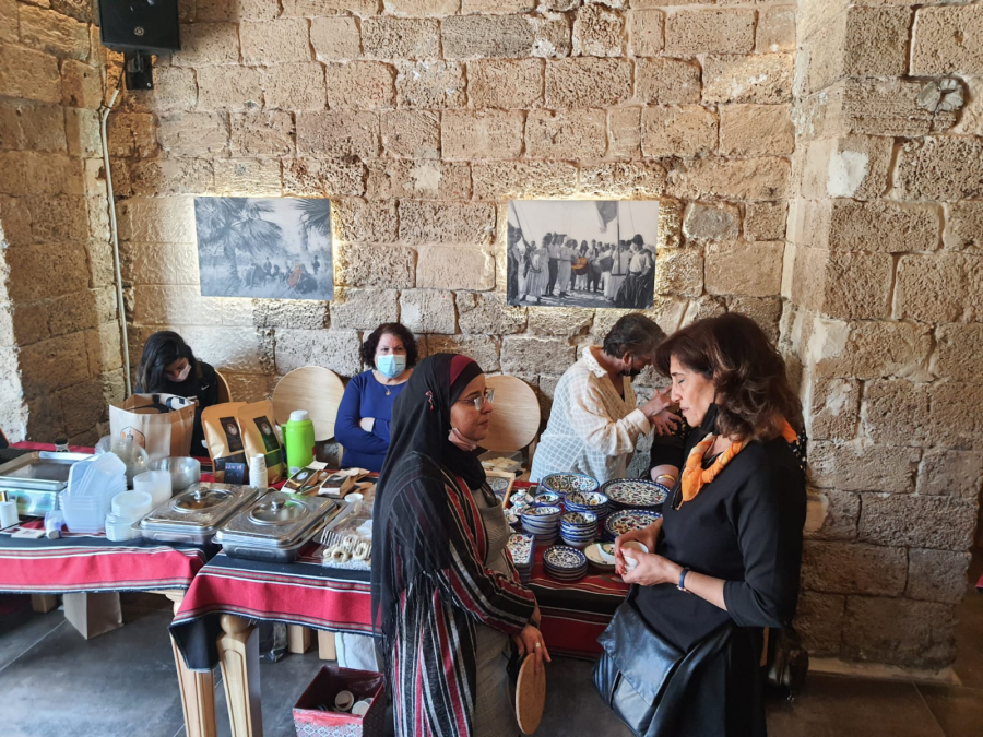 بين الاكشاك : منتجات "دكان متل الجديد" لجمعية عروس البحر منتجات تطريز فلاحي, رسومات بالزيت, اكياس مع كتابات فنية وغيرها.