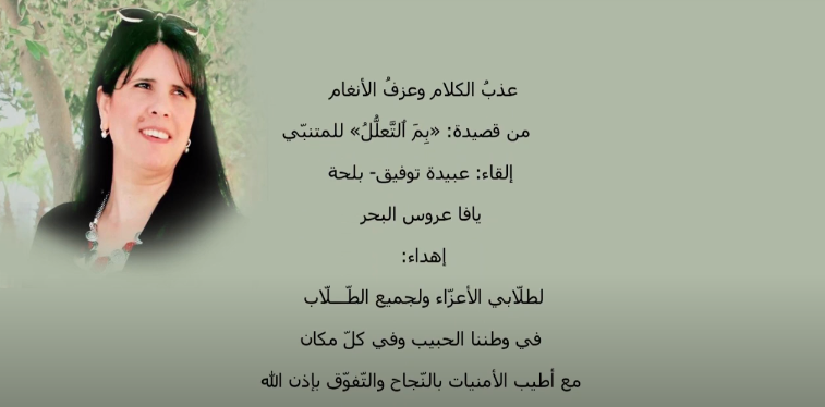 ضمن مشروع "عذبُ الكلام وعزفُ الأنغام" الّذي تهديه المربّية عبيدة توفيق- بلحة لطلّابها، ولكلّ طلّاب المرحلة الثّانويّة المتقدّمين لامتحان التّوجيهيّ في أدب اللّغة العربيّة/الوحدة الأولى، ولزملائها المعلّمين والمعلّمات في يافا، وسائر البلدان في الوطن الحبيب وفي كلّ مكان، تقدّم لكم اليوم تسجيلًا للأبيات المطلوبة لامتحان الثّانويّة العامّة في أدب اللّغة العربيّة من قصيدة "بِمَ التَّعلُّلُ" للمتنبّي.