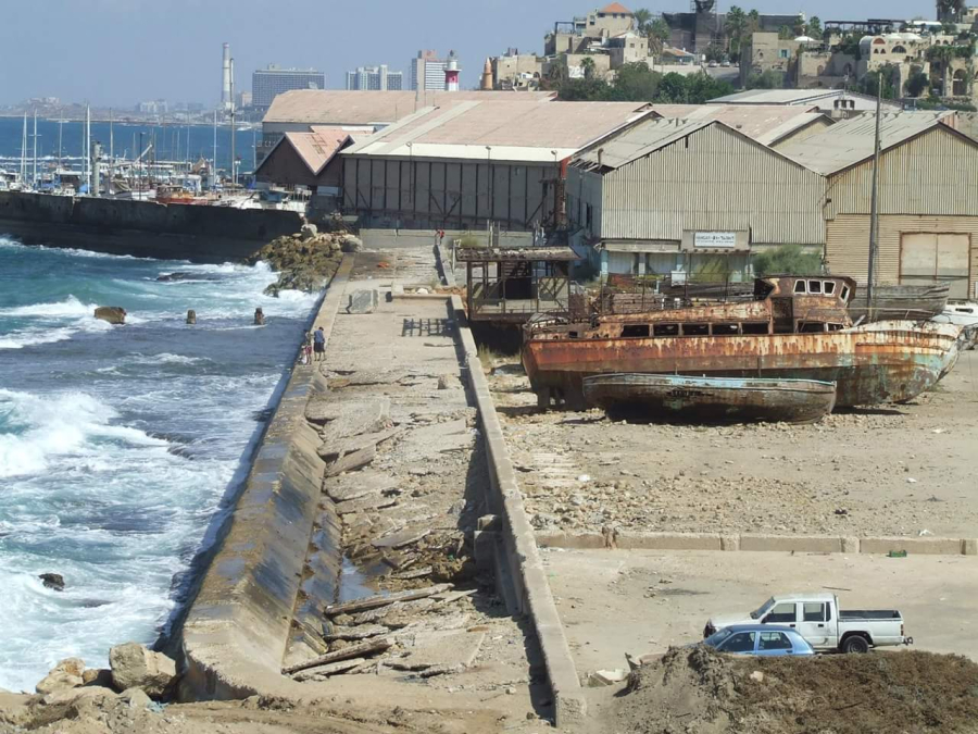 ويشاهد في احدى الصور بقايا البيوت "الطمم" التي تم هدمها في حي العجمي وقد تم القاء ردمها بالقرب من الميناء، حيث هُدم أكثر من 150 دونماً من البيوت ونقل ردمها للميناء.