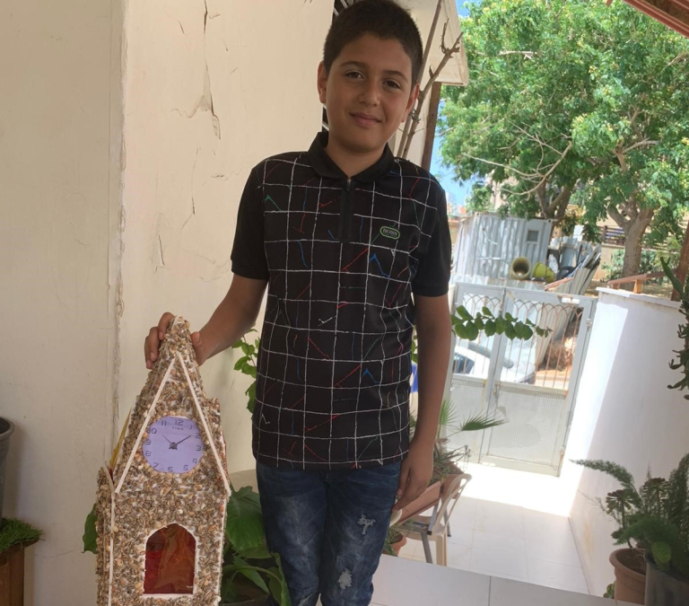 قام الطفل فضل سعيد أبو قاعود من مدينة يافا، بتصميم مجسّم يحاكي برج الساعة الشهير من مدينة يافا، وذلك باستخدام الصدف والكرتون.