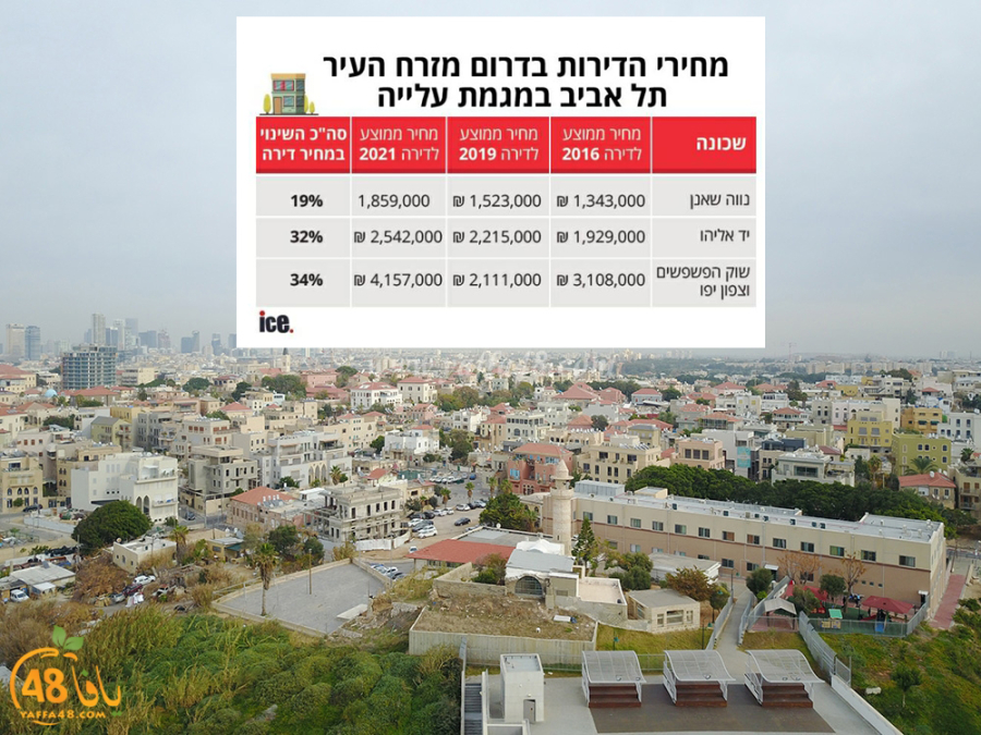 أفاد مراسل يافا 48 أن أسعار العقارات والبيوت في مدينة يافا شهدت مزيداً من الارتفاع خلال العامين الماضيين وصلت نسبته الى 34%، حيث تشير التقارير الى أن البيوت التي كان يصل سعرها الى 2 مليون شيكل في عام 2019، ارتفع ليصل الى أكثر من 4 مليون شيكل في العام 2021، خاصة تلك البيوت الواقعة في شمال يافا وشمال حي العجمي.