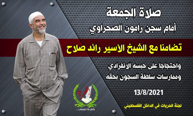 تقام اليوم أمام سجن “رامون” في صحراء النقب، صلاة جمعة سيكون خطيبها الشيخ محمد عارف وتد، وقد دعت إليها لجنة الحريات المنبثقة عن لجنة المتابعة العليا للجماهير العربية، تضامنا مع الأسير الشيخ رائد صلاح، المعتقل في العزل الانفرادي في سجن “رامون”.