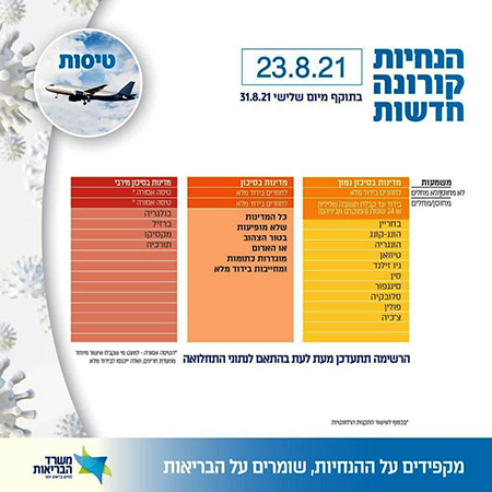 قامت وزارة الصحة ، هذه الليلة، بتحديث تصنيف الدول المختلفة، بناء على مستوى إصابات الكورونا فيها. ويدخل التصنيف الجديد حيز التنفيذ في 31.8.2021. وبحسب القائمة الجديدة فإن المسافرين الذي يعودون الى البلاد من البحرين وبولندا لن يكونوا ملزمين بحجر صحي كامل (14 يوما) وانما فقط حتى الحصول على نتيجة سلبية لفحص الكورونا الذي يتم إجراؤه في المطار.