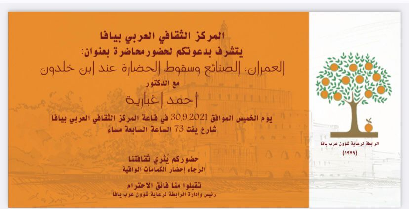 تدعوكم الرابطة لرعاية شؤون عرب يافا، والمركز الثقافي العربي بمدينة يافا لحضور محاضرة بعنوان "العمران، الصنائع وسقوط الحضارة عند ابن خلدون"، مع الدكتور أحمد اغبارية.