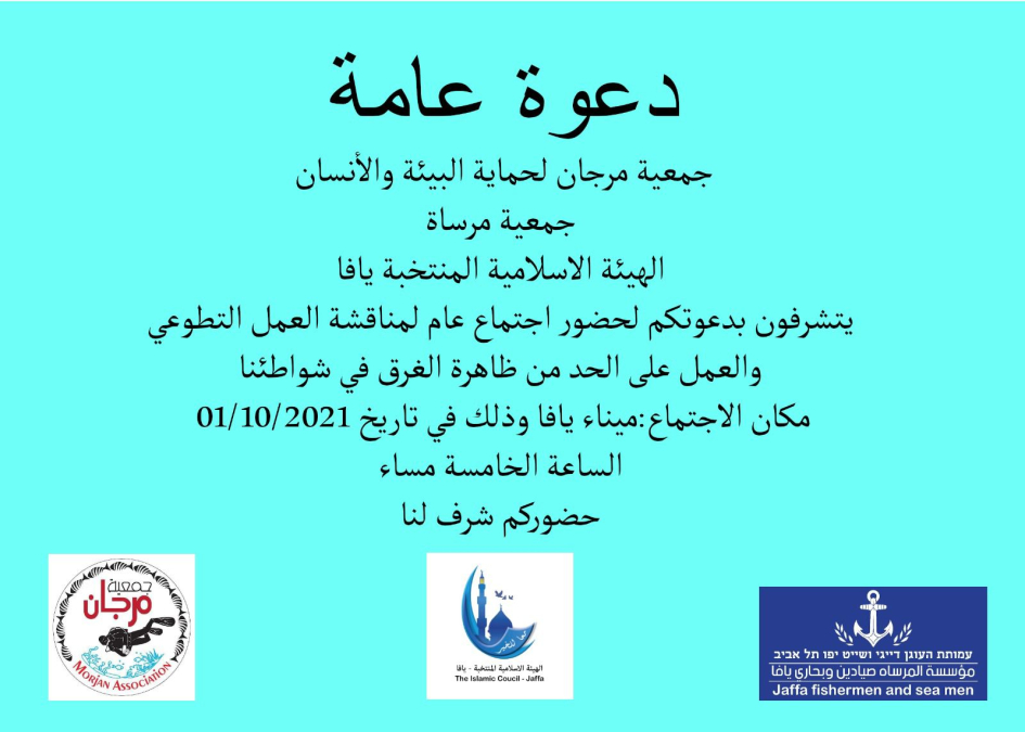 تدعوكم جمعية مرجان لحماية البيئة والانسان وجمعية مرساة، والهيئة الاسلامية المنتخبة بيافا، الى المشاركة يوم غدٍ الجمعة في الاجتماع العام الذي سيناقش العمل التطوعي للحد من ظاهرة الغرق على شواطئ المدينة.
