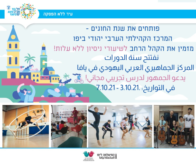 يدعو المركز الجماهيري الأهالي في يافا الى المشاركة في الدروس التجريبية المجانية لدورات المركز التي يقدمها، وذلك اليوم الأحد وحتى 7.10.2021.