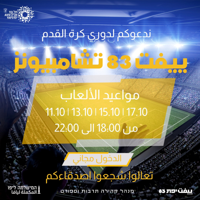 يدعوكم مركز الشبيبة في يافا ييفت 83 لحضور ألعاب دوري كرة قدم "ييفت 83 تشامبيونز" الذي تنطلق ألعابه يوم الاثنين القادم 11.10 الساعة السادسة مساءً ويستمر حتى يوم الأحد 17.10 في ملعب مركز الشبيبة (البوعيل).