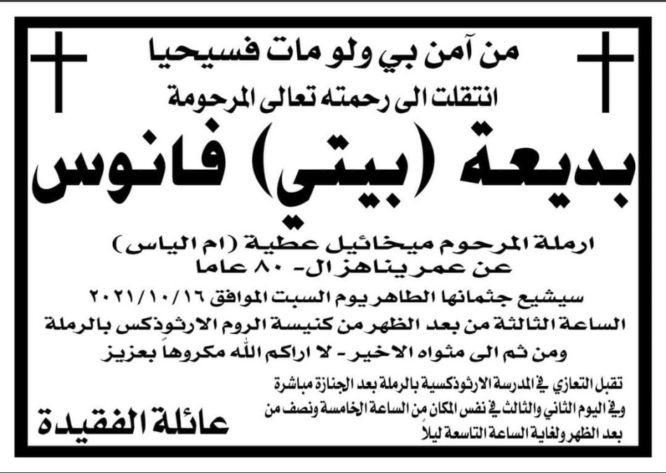 تُوفيت صباح اليوم الجمعة 15.10.2021 السيدة بديعة (بيتي) فانوس " أم الياس" من مدينة الرملة، عن عمر ناهز 80 عاماً، حيث سيتم تشييع جثمانها غداً السبت الساعة 3 بعد الظهر، من أمام كنيسة الروم الأرثوذكس بالرملة.