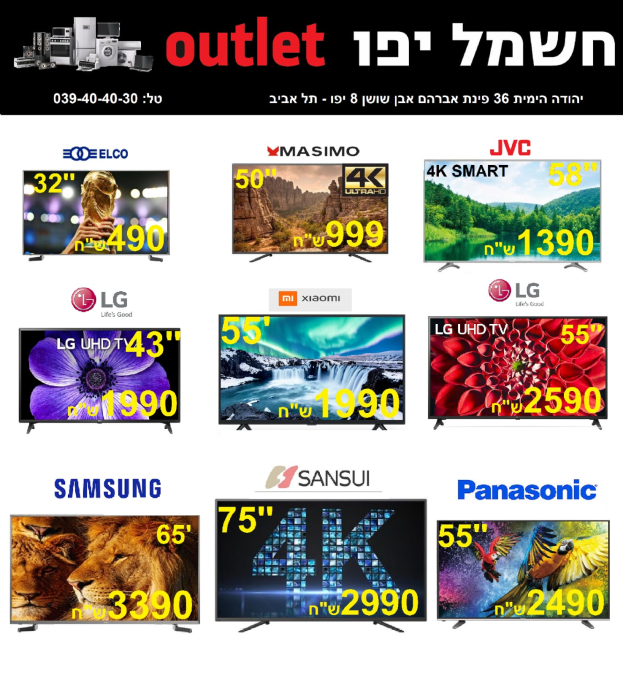 يُصادف اليوم الثلاثاء مرور 4 سنوات على افتتاح أكبر صالة عرض للأجهزة الكهربائية في مدينة يافا "OUTLET"، وبهذه المناسبة تُعلن عن حملة تخفيضات كبرى على مجموعة واسعة من الأجهزة الكهربائية، والتي تشمل (تلفزيونات، غسالات، ثلاجات، أفران غاز، أفران كهربائية، خلاطات) وغيرها الكثير.