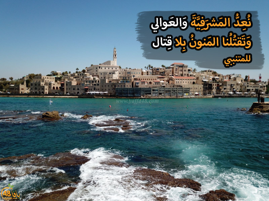 ما زال موقع يافا 48 مستمر معكم في نشر مختارات من أجمل القصائد، مع مقاطع جوية رائعة لمدينة يافا، وهذه المرة نستمع لقصيدة "نُعِدُّ المَشرَفِيَّةَ وَالعَوالي" للشاعر الكبير أبو الطيب المتنبي، والتي يقول فيها: