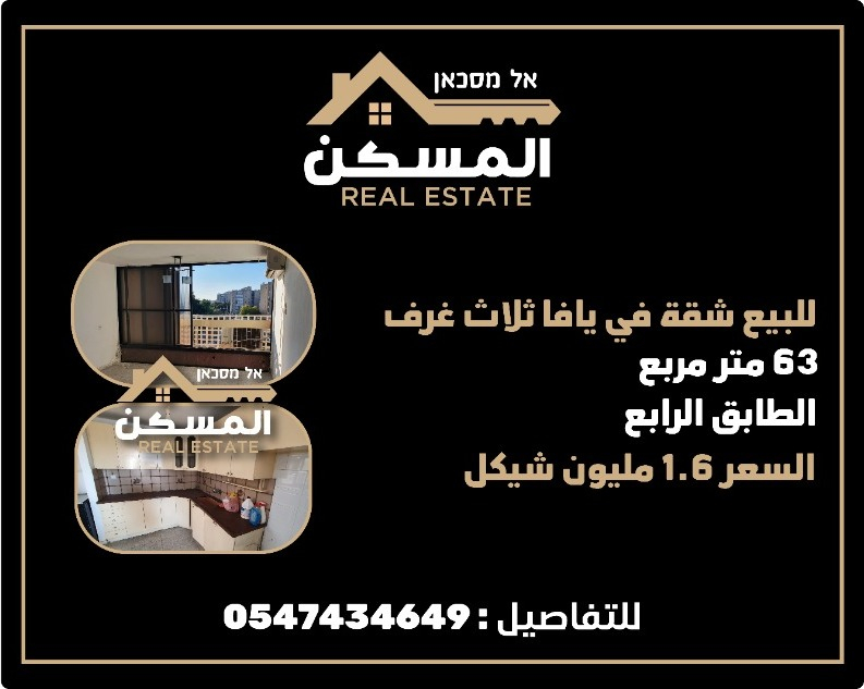 أعلنت شركة مسكن للعقارات في مدينة يافا، عن توفّر شقة للبيع في مدينة يافا، حيث تبلغ مساحة الشقة 63 متراً في الطابق الرابع من البناية، تحتوي الشقة على 3 غرف.