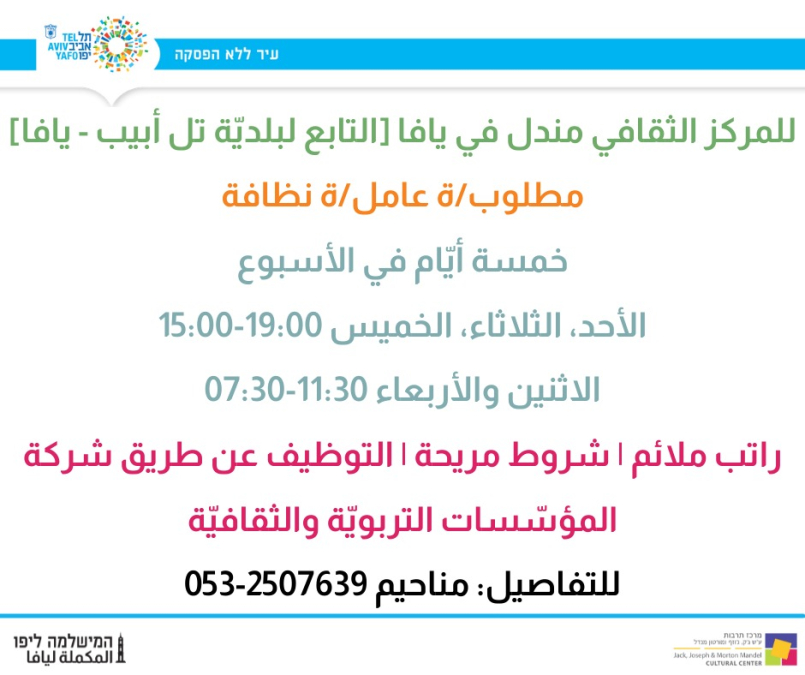 يُعلن المركز الثقافي مندل في يافا التابع لبلدية يافا تل ابيب، عن حاجته لعامل/ة نظافة.