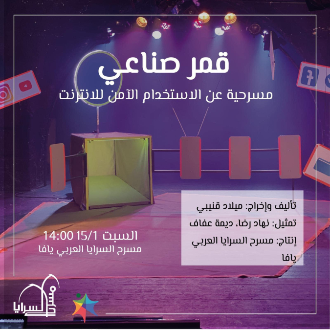 يقدم مسرح السرايا في مدينة يافا اليوم السبت مسرحية الأطفال "قمر صناعي" لميلاد قنيبي عن الاستخدام الآمن للانترنت والهاتف الذكي وذلك في تمام الساعة 14:00 - انضموا الينا مع أطفالكم لمشاهدة المسرحية.