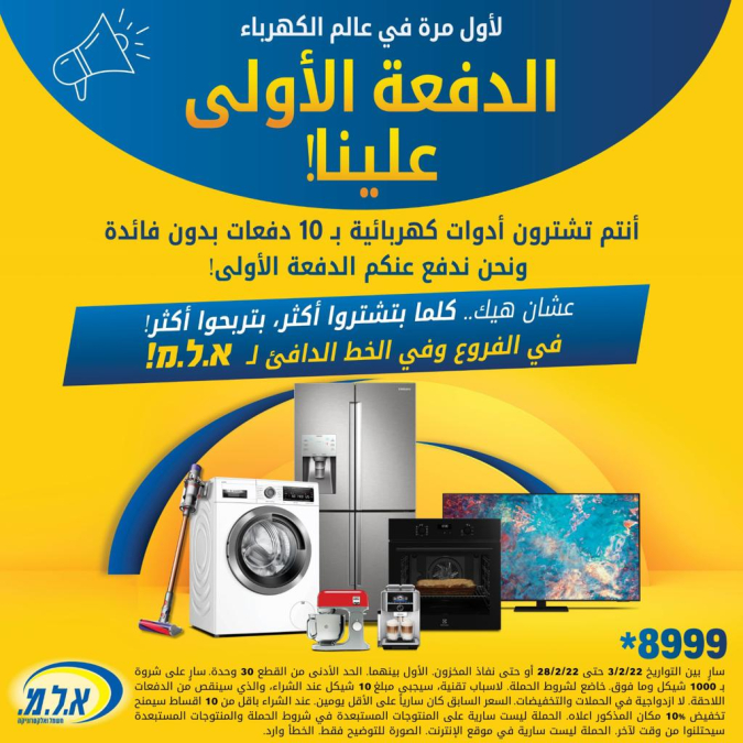الى سكان يافا والمنطقة، اشتري الآن من "ا.ل.م" (א.ל.מ) للأدوات الكهربائية، بالتقسيط المريح، والدفعة الأولى على "ا.ل.م" وبدون فوائد.