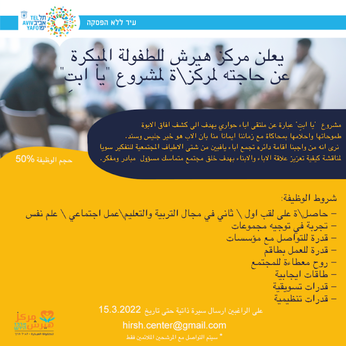 يُعلن مركز هيرش للطفولة المبكرة في مدينة يافا، عن حاجته لمركز/ة مشروع "يا أبتِ"، والذي هو عبارة عن ملتقى أباء حواري يهدف الى كشف آفاق الأبوة وطموحاتها وأحلامها، بمحاكاة مع زماننا، ايماناً منا بأن الأب هو خير جليس وسند.