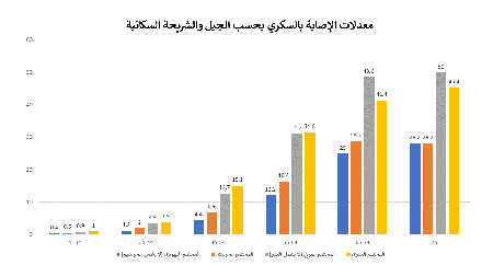 أما في المجتمع العربي فأشارت المعطيات إلى أنّ مرض السكري ينتشر بشكل ملحوظ ومقلق، إذ تبيّن أنّ انتشار السكري كان عاليًا بالنسبة للعرب ذكورًا وإناثًا، مقارنة مع اليهود في البلاد وذلك بحسب الاحصائيات الأخيرة التي أجريت. (مرفق رسم بياني لمعدلات الإصابة بالسكري بحسب الجيل والشريحة السكانية من سجل السكري الوطني 2019 في وزارة الصحة).