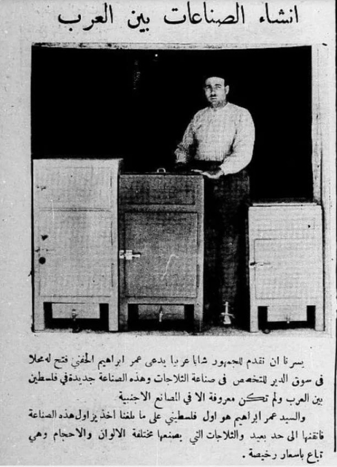 حصل موقع يافا 48 على صورة نادرة جداً يرجح انها يعود تاريخها لعام 1943 يظهر فيها اول شخص فلسطيني قام بصناعة الثلاجات واول من زاول هذه المهنة في فلسطين وهوا الشاب اليافاوي عمر ابراهيم الحفني.