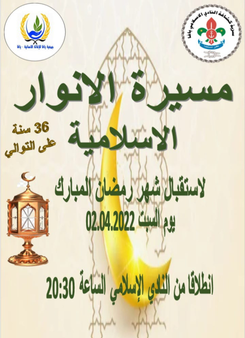 تعلن سرية كشاف النادي الاسلامي في يافا أن مسيرة الانوار ستنطلق يوم السبت الموافق 2.4.2022 في تمام الساعة الثامنة والنصف مساءً من مقر النادي الاسلامي في المدينة وذلك بالتعاون مع جمعية يافا للاغاثة الانسانية.