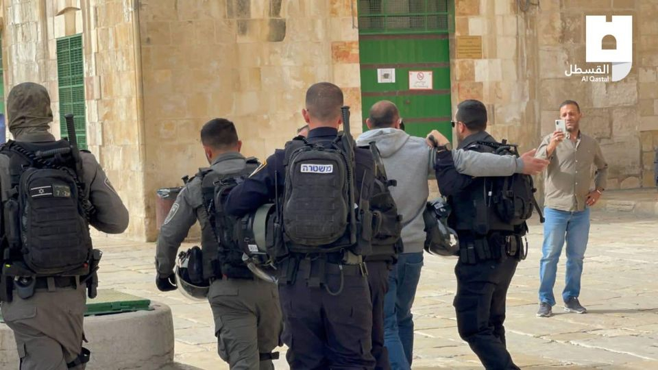 ولاحقت الحشود من المصلين في ساحات الحرم واعتدت عليهم، كما قامت باعتقال عددا من الشبان داخل المسجد، وهددت المئات من المعتكفين بالقمع وأطلقت قنابل الصوت صوبهم وطالبتهم بمغادرة الساحات، وأجبرت الفلسطينيين ممن تواجدوا بساحات الحرم بالدخول إلى المصليات وإغلاق الأبواب عليهم، لحين انتهاء اقتحامات المستوطنين.