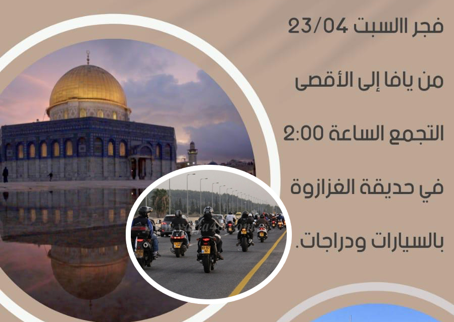 دعت الهيئة الإسلامية المنتخبة في مدينة يافا الأهالي وأصحاب السيارات والدراجات النارية الى المشاركة في مسيرة الدراجات النارية والسيارات التي ستنطلق فجر السبت 23.4.2022 الى المسجد الأقصى المبارك لأداء صلاة الفجر.