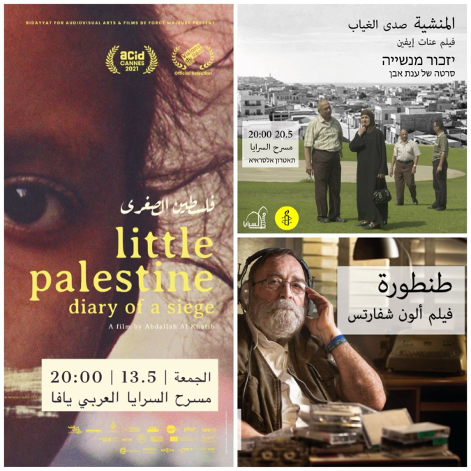 ينظّم مسرح السرايا في يافا برنامجا سينمائيًا ثقافيًا لنهاية الأسبوع الجاري والقادم وفيه ستُعرض ثلاث أفلام: فلسطين الصغرى، المنشية صدى الغياب وطنطورة.