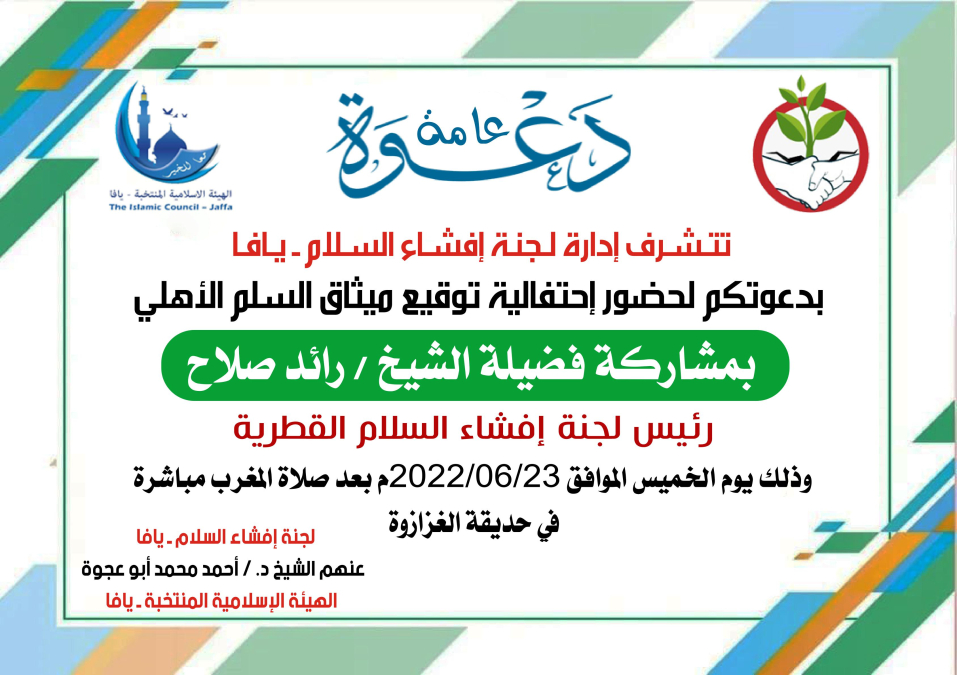 ميثاق السلم !!! وكانو كلنا فاهمين شو هادا. فسروا اشرحوا عشان الكل يفهم شو هادا. انا متاكده انو كتير ناس رح يجوا وهمي اصلا مش فاهمين شو هادا ميثاق السلم يا عمي فسروا لاهل يافا شو هادا خلي الصغير والكبير. العلمي والمثقف يعرف على شو رح توقعوا