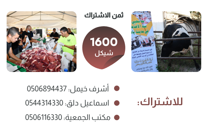 وبحسب الجمعية فإنه سيتم جمع الاشتراكات وشراء أفضل أنواع العجول وذبحها وتوزيع لحومها على المشتركين وعلى العائلات المستورة في المدينة، حيث سيشترك كل سبعة أشخاص بقيمة عجل لكل شخص 1600 شيكل.